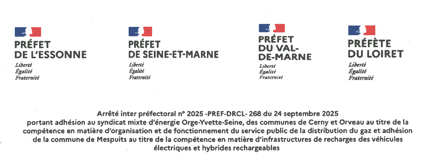 Parution de l’arrêté inter préfectoral n° 2025 -PREF-DRCL- 268 du 24 septembre 2025 portant adhésion au syndicat mixte d’énergie Orge-Yvette-Seine, des communes de Cerny et Orveau au titre de la compétence en matière d’organisation et de fonctionnement du service public de la distribution du gaz et adhésion de la commune de Mespuits au titre de…